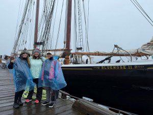 We woke up to rain on Sunday, and since many of us were booked to sail on the Bluenose II in the afternoon we consulted the weather forecast every few minutes. Although the forecast was for the rain to stop by noon, we all boarded the Bluenose at 1:00 wearing blue plastic ponchos over many layers of clothing. The fog and rain meant we had no idea where we were on the ocean, but it was still a thrill to be at sea on board this national treasure.